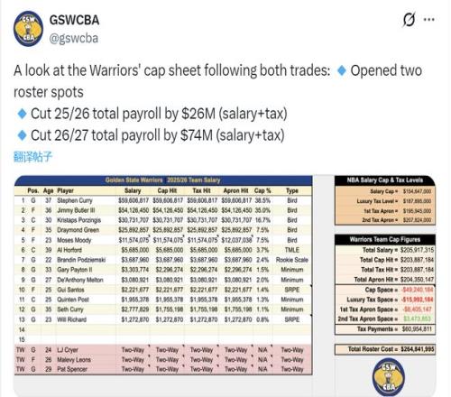 勇士在去年夏天引进了霍福德,如今又将波神招致麾下,这样一来绿军2023-24赛季夺冠时的两大中锋都来到了勇士。有些遗憾的是,这两位大个子的状态比两年前又下滑了一些。勇士是不可能指望靠这样的阵容去冲击冠军的。勇士这笔交易背后的一个目的是省钱。通过这笔交易,勇士在本赛季共计节约2600万美元薪水和奢侈税,能在下赛季节约7400万美元薪水和奢侈税,合计预计节约1亿美元。